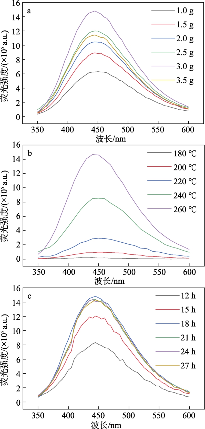 图1 PA6 用量(a)、反应温度(b)、反应时间(c)对6CDs 荧光强度的影响
