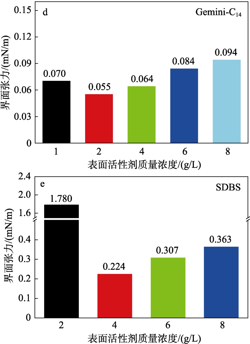 相同质量浓度下,随着疏水链长的增加,界面张力呈下降趋势。当表面活性剂质量浓度为2 g/L时,疏水链碳数为8 时界面张力为0.684 mN/m(图6a),尾链碳数增加到14 时界面张力降为0.055 mN/m(图6d),下降1 个数量级。原因在于疏水链长增加,疏水性增强,表面活性剂在油水界面的相互作用增大,界面活性提高,使得界面张力有效降低[37],甚至使得Gemini-C12、Gemini-C14 比SDBS 的界面活性还要高。