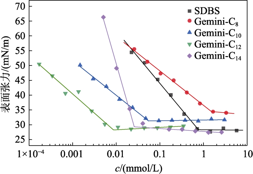在25 ℃下,配制不同浓度的Gemini-Cn 水溶液,采用 Wilhelmy 吊片法测量溶液平衡表面张力(γ)[21]。使用去离子水校准仪器,测得水的表面张力为(72.0±0.8) mN/m 时符合使用标准。根据测得的数据绘制表面张力(γ)-表面活性剂溶液浓度(c,mmol/L)的关系曲线,曲线转折点时的浓度为CMC,在CMC 处对应的表面张力为γCMC。