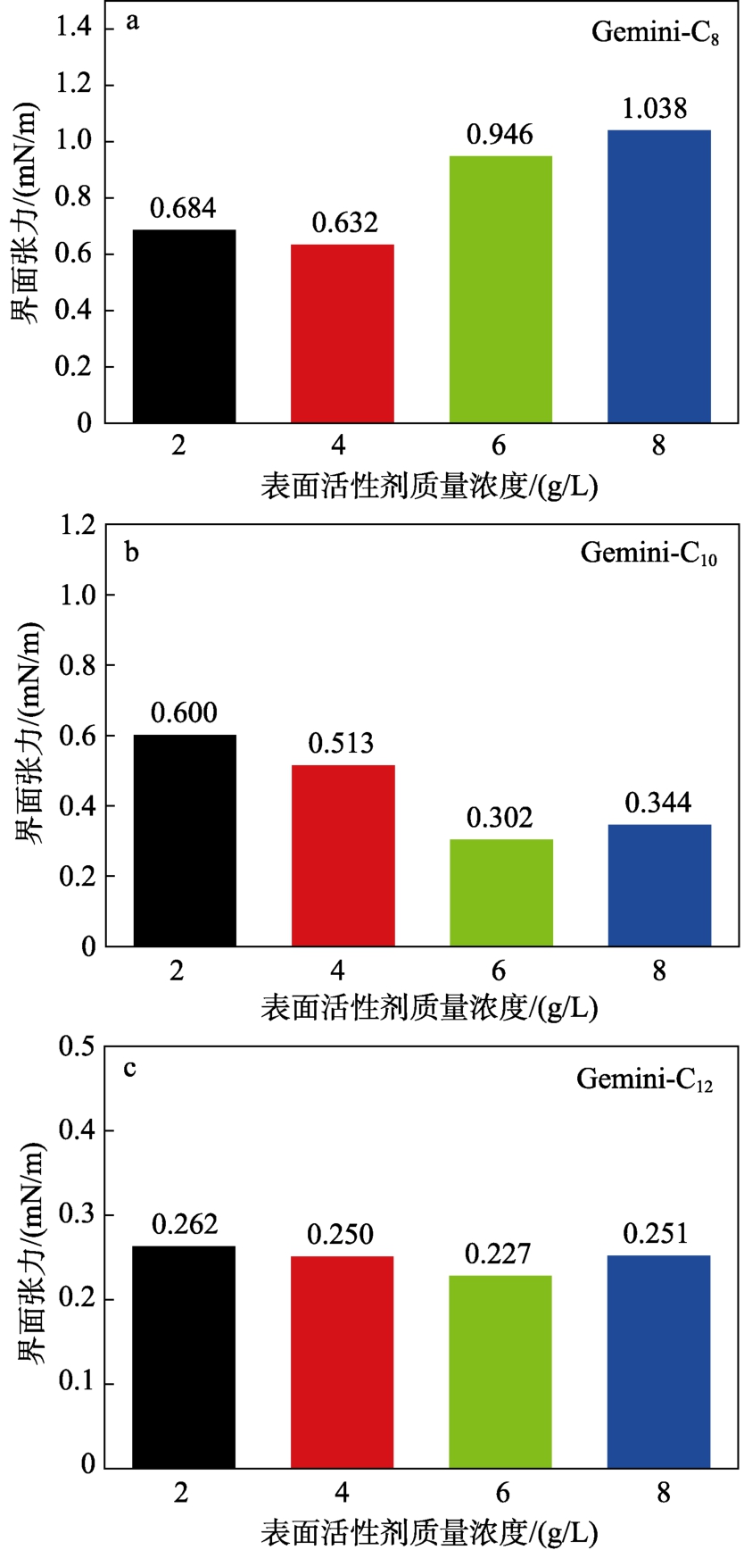 从图6 可以看出,随着表面活性剂水溶液质量浓度的增大,表面活性剂的界面张力皆呈现先降低后升高的趋势。以Gemini-C8 为例,当Gemini-C8的质量浓度<4 g/L 时,随着质量浓度的增加,界面张力持续降低至最低,为0.632 mN/m,当质量浓度>4 g/L 后,随着质量浓度的增加,界面张力反而增大。这是因为,在低质量浓度下表面活性剂在油水界面的吸附聚集尚未达到饱和,随着质量浓度的增大,油水界面吸附的表面活性剂持续增多,界面张力持续降低[34];当达到最大吸附量时,界面张力达到最低;此时再增大质量浓度,表面活性剂在油水界面上会发生过度吸附,导致界面吸附层的厚度以及刚性增加,使得界面张力不减反升[35-36]。