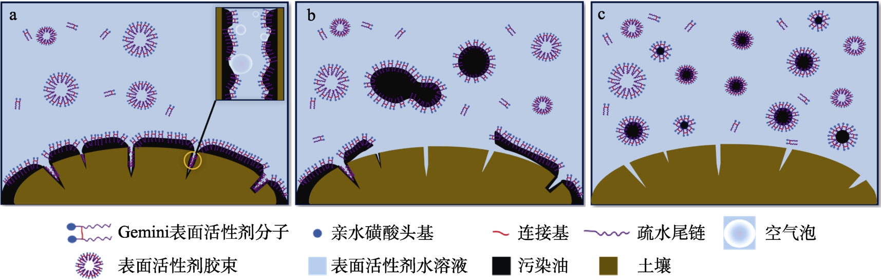(3)增溶过程:如图9c 所示,为防止油滴的聚集,胶束的增溶起到至关重要的作用。在搅拌或振荡下,大尺寸的油滴逐渐被分散,小尺寸油滴被溶液中表面活性剂胶束捕获包裹,形成纳米尺寸的聚集体。而吸附在聚集体表层的表面活性剂分子存在头基之间的排斥作用,可以有效阻止油滴的聚结,防止油滴再次吸附土壤,达到除油效果。