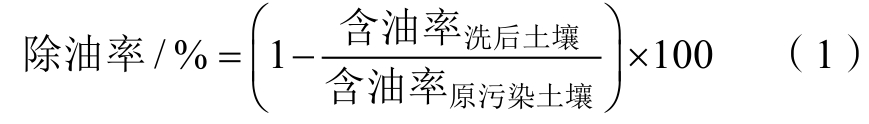 将清洗后的土壤研磨,以氯仿为萃取剂,采用超声萃取-紫外分光光度法[23-24]测定土壤的含油率(即土壤中油含量),并根据清洗前后土壤的含油率,按公式(1)计算清洗后土壤的除油率。