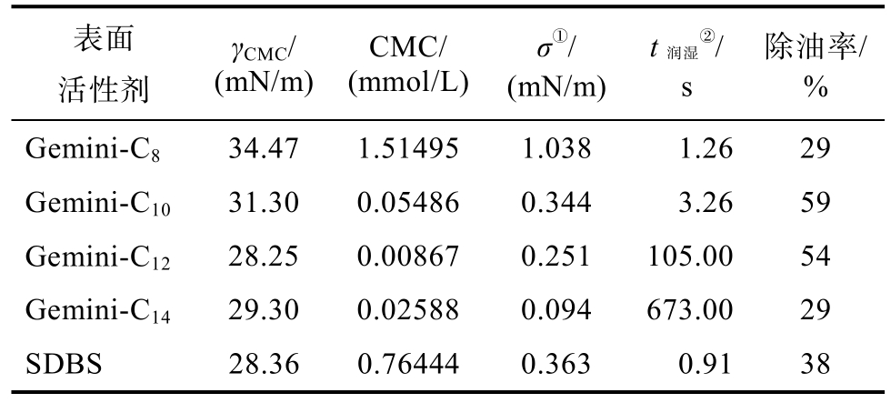 表面活性剂γCMC/(mN/m)CMC/(mmol/L)σ①/(mN/m)t 润湿②/s除油率/%Gemini-C8 34.471.51495 1.038 1.2629 Gemini-C1031.300.05486 0.344 3.2659 Gemini-C1228.250.00867 0.251 105.0054 Gemini-C1429.300.02588 0.094 673.0029 SDBS 28.360.76444 0.363 0.9138