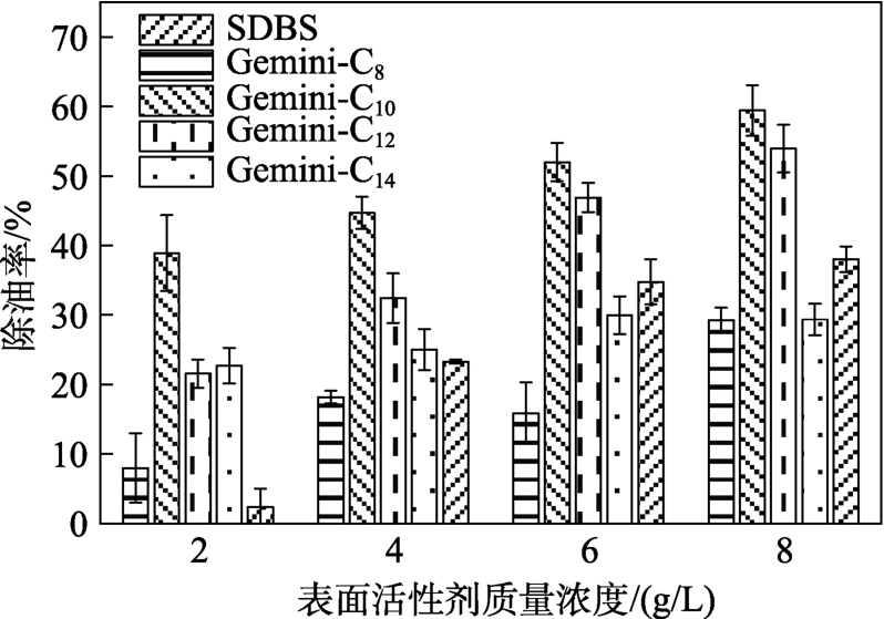 从图8 可以看出,随着表面活性剂质量浓度的增大,除油率大致呈增大的趋势,其中SDBS 与Gemini-C14 质量浓度>6 g/L 后除油率变得平稳。相同质量浓度下,对于不同链长的Gemini-Cn,随着疏水链长的增大,除油率大体上先增大后减小,Gemini-C8 和 Gemini-C14 的除油效果较差,而Gemini-C10 和Gemini-C12 的除油效果都比SDBS 好,尤其是Gemini-C10,当其质量浓度为2 g/L 时,除油率达到39%,当其质量浓度为8 g/L 时,除油率为59%。与质量浓度为8 g/L 的SDBS 的除油率(38%)相比,Gemini-C10质量浓度为SDBS 的1/4 即可达到相同的除油效果;质量浓度均为8 g/L 时,Gemini-C10 的除油率比SDBS 同比提高21%,除油性能增效明显。