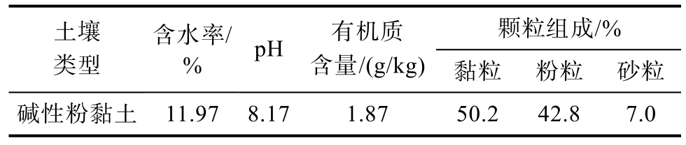 颗粒组成/%土壤类型含水率/% pH有机质含量/(g/kg) 黏粒 粉粒 砂粒碱性粉黏土 11.97 8.171.87 50.2 42.87.0
