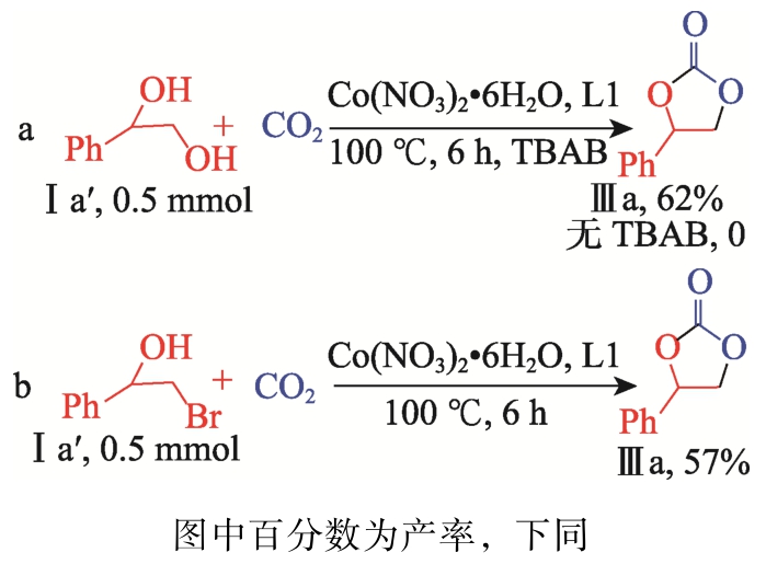 以碳酸苯乙烯酯(Ⅲa)的合成为例。向15 mL两口反应管(一支口连接CO2 气球,即0.1 MPa)中依次加入 120 mg(1.0 mmol)Ⅰa、14.6 mg(0.05 mmol)Co(NO3)2·6H2O、17 mg(0.10 mmol)L1、6.5 mg(0.02 mmol)TBAB。反应管置换3 次CO2 后,于100 ℃下搅拌6 h。反应完毕,用5 mL乙酸乙酯萃取3 次,合并有机相,无水硫酸钠干燥30 min,浓缩,经硅胶色谱柱纯化〔V(石油醚)∶V(乙酸乙酯)=5∶1),得138.6 mg 白色固体,即产物Ⅲa。