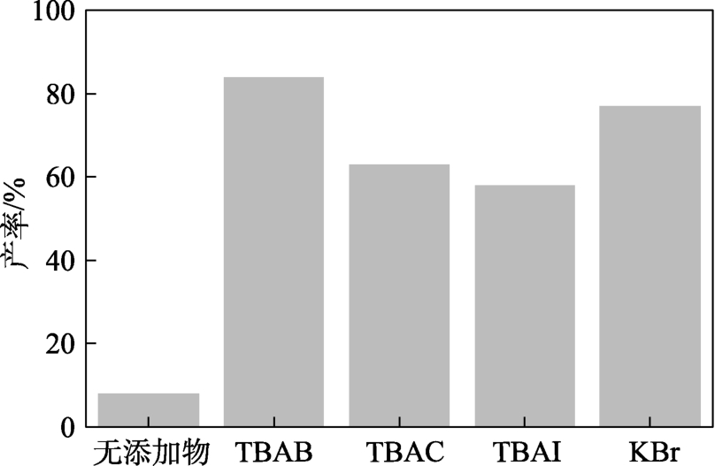 由图3 可知,无添加物时,Ⅲa 产率很低;加入卤化盐时,Ⅲa 产率明显上升,说明添加物参与了催化循环,改变了反应过渡态,促进了反应进行。由于TBAB 中阳离子对溴离子合适的束缚能力,使其能够较好地与环氧化物生成中间体,催化活性高于TBAC、TBAI 及KBr。综上所述,选择TBAB 为反应合适添加剂。