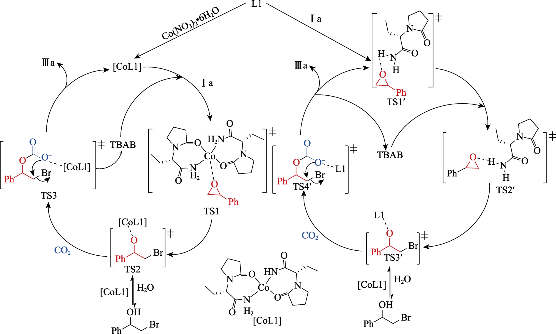基于以上结果,模板反应的合理机理示意图如图8 所示。L1 与Co(NO3)2·6H2O 配位形成[CoL1][25],在TBAB 作用下,其活化Ⅰa 转化为过渡态TS1。随后,TS1 快速转化为TS2,与CO2 反应形成TS3,并伴有1-苯基-2-溴代乙醇生成。TS3 通过分子内亲核反应而生成Ⅲa。同时,L1 通过氢键活化Ⅰa 转化为TS1′,并在TBAB 的辅助下形成TS2′。TS2′转化为TS3′,随后,与CO2 反应转化为TS4′,并伴有1-苯基-2-溴代乙醇生成。TS4′通过分子内亲核反应生成Ⅲa。