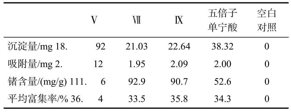 Ⅴ Ⅶ Ⅸ 五倍子单宁酸空白对照沉淀量/mg 18.92 21.03 22.64 38.32 0吸附量/mg 2.12 1.95 2.09 2.00 0锗含量/(mg/g) 111. 6 92.9 90.7 52.6 0平均富集率/% 36.4 33.5 35.8 34.3 0